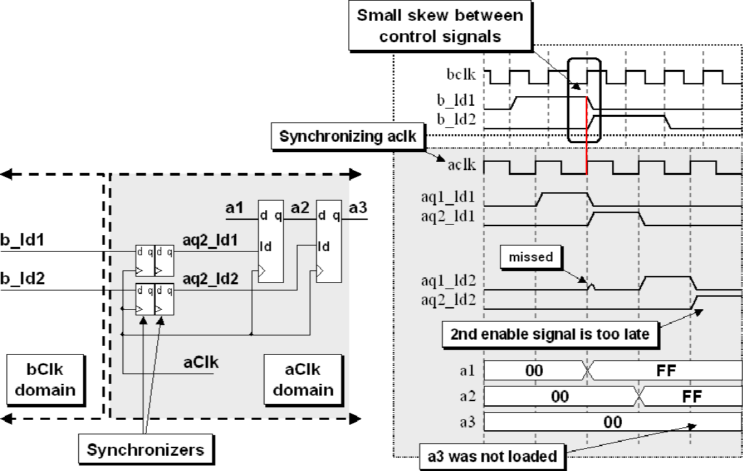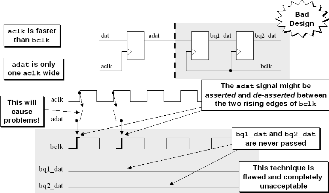 - 来自发送时钟域的信号在被采样之前可能会变化两次,或者可能太接近较慢时钟域的采样边缘。